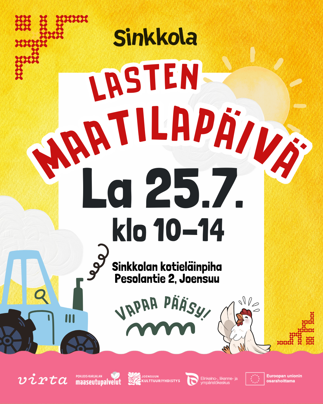 Kutsumme teidät lämpimästi mukaan Lasten maatilapäivä -tapahtumaan joka järjestetään lauantaina 25.7.2026 klo 10–14 Sinkkolassa, Joensuussa. Tapahtuma järjestetään nyt toista kertaa ja ohjelmassa on koneita, työnäytöksiä, työpajoja, eläimiä ja perheille suunnattua toimintaa. Haluaisimme tänä vuonna tuoda esille erityisesti pohjoiskarjalaisia kyliä.